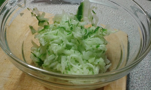 Ogórek obieramy w taki sposób by pozostała połowa skórki, ucieramy go na grubej tarce solimy i odstawiamy co najmniej na 15 minut, żeby wypuścił sok, który odlewamy.