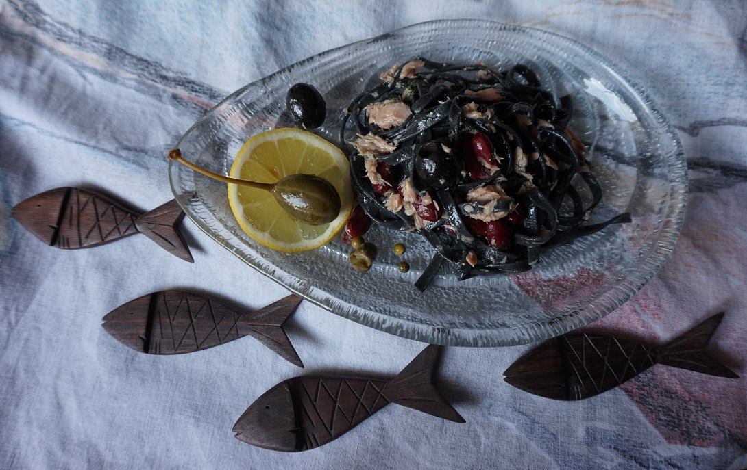 No dobrze, miała być sałatka. Kilka dni później sobie pomyślałam zrobię sałatkę z tuńczyka, gdzieś miałam przepis, myślałam dalej, ale gdzie? Myśląc gdzie jest przepis przypomniał mi się makaron z atramentem z kałamarnicy, czyli czarny makaron. Przepis przestał być potrzebny, bo był bez makaronu. Toteż poszłam na tak zwany żywioł kulinarny, jak prawdziwy awangardowy artysta…