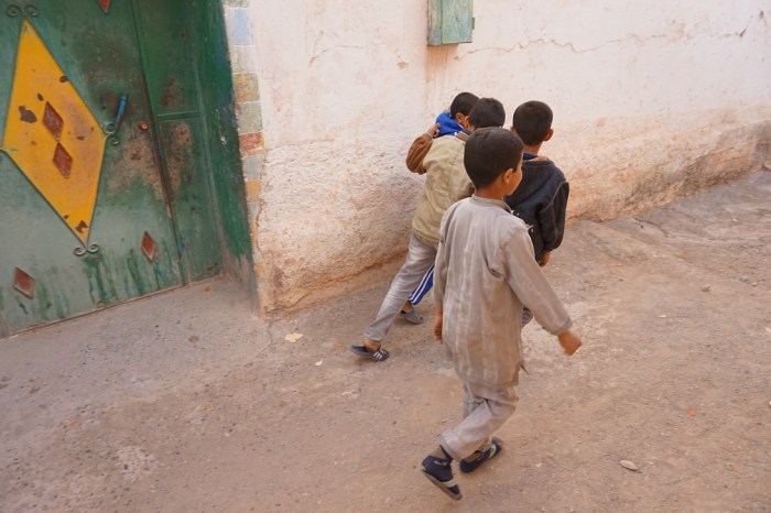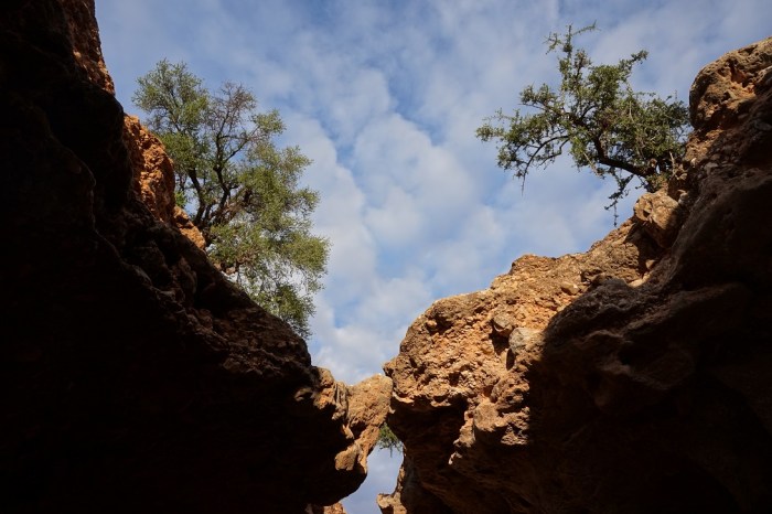 Jedziemy dalej po kamienistej ziemi i drodze porośniętej drzewami arganowymi w pobliskie góry zobaczyć niewielki kanion. Trafiamy do następnej nieco większej wioski i ku uciesze dzieci przechodzimy przez wioskę w kierunku gór do wąwozu Adar, dzieci oczywiście pędzą za nami radośnie pokrzykując i biegając, ostatecznie pozostają w wiosce.