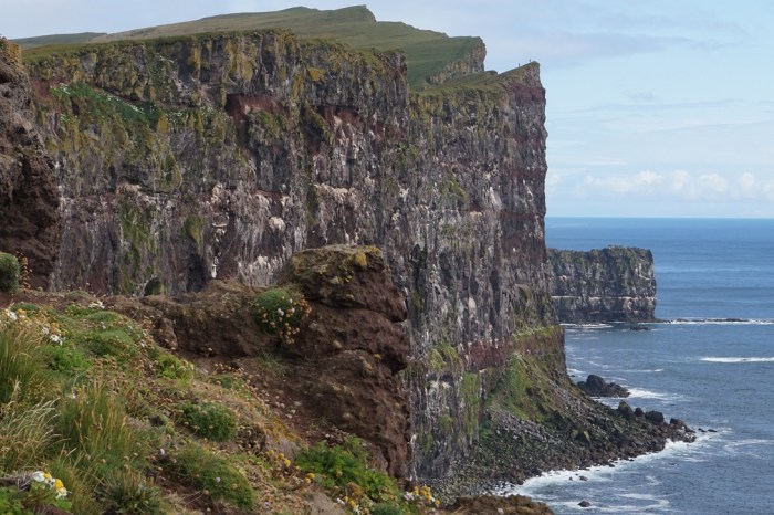 Aż w końcu zmienia się krajobraz i rosną klify, początkowo są kremowo- szare, z żółtymi plażami u podnóża, aż rosną i rosną by zmienić się w przepiękne czarno- brązowe monumentalne skały pokryte zielenią traw. Warto było się trudzić.